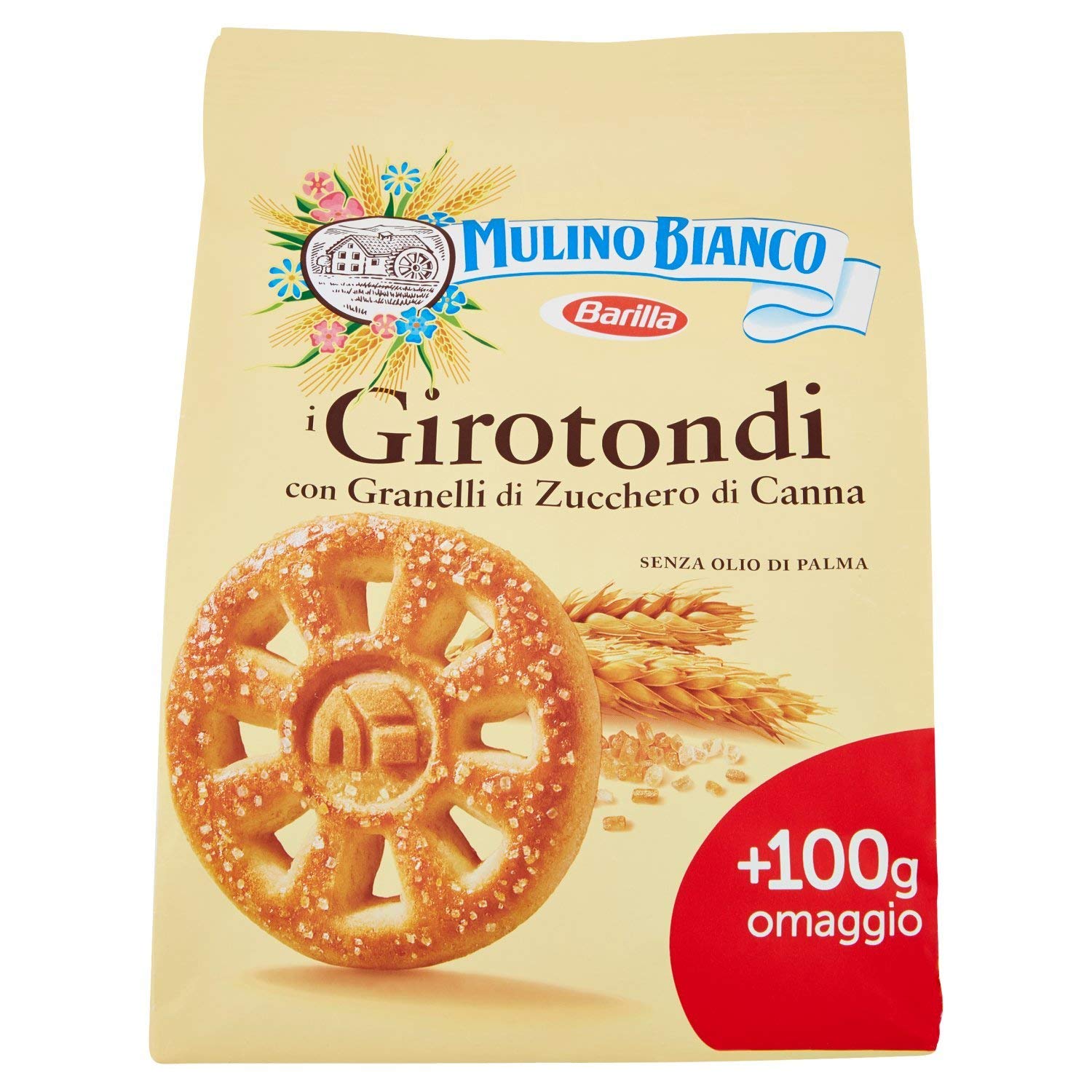 Biscotti Girotondi 800g Mulino Bianco Barilla. Tutto il buono che senti Farina di frumento ideale per biscotti Zucchero di canna ambrato in superficie.I nostri mugnai di fiducia selezionano solo i grani a partire dai quali si ottiene la farina ideale per regalarti un’esperienza di gusto semplice e croccante. Per lo zucchero di canna selezioniamo solo quello ambrato in cristalli grossi per conferire ai Girotondi quella rudività che senti quando li assapori.Il buono che non vedi – Per la nostra produzione acquistiamo 100% energia elettrica proveniente da fonti rinnovabili. – Tutti i nostri biscotti sono: senza olio di palma – senza grassi idrogenati – senza coloranti www.mulinobianco.itUna porzione di 6 Girotondi ti fornisce 240 kcal pari al 12% circa dell’assunzione energetica di riferimento giornaliera*. *Calcolato su una dieta da 2.000 kcal/giorno.Variare spesso i cibi e seguire uno stile di vita fisicamente attivo è il modo giusto per avere una vita sana.Ingredienti Farina di frumento 59,5%, Zucchero, Olio di girasole, Amido di frumento, Zucchero di canna 3,7%, Latte scremato in polvere, Agenti lievitanti (carbonato acido d’ammonio, carbonato acido di sodio), Proteine del latte, Sale, Aroma vanillina, Può contenere tracce di frutta a guscio, soia e uova
