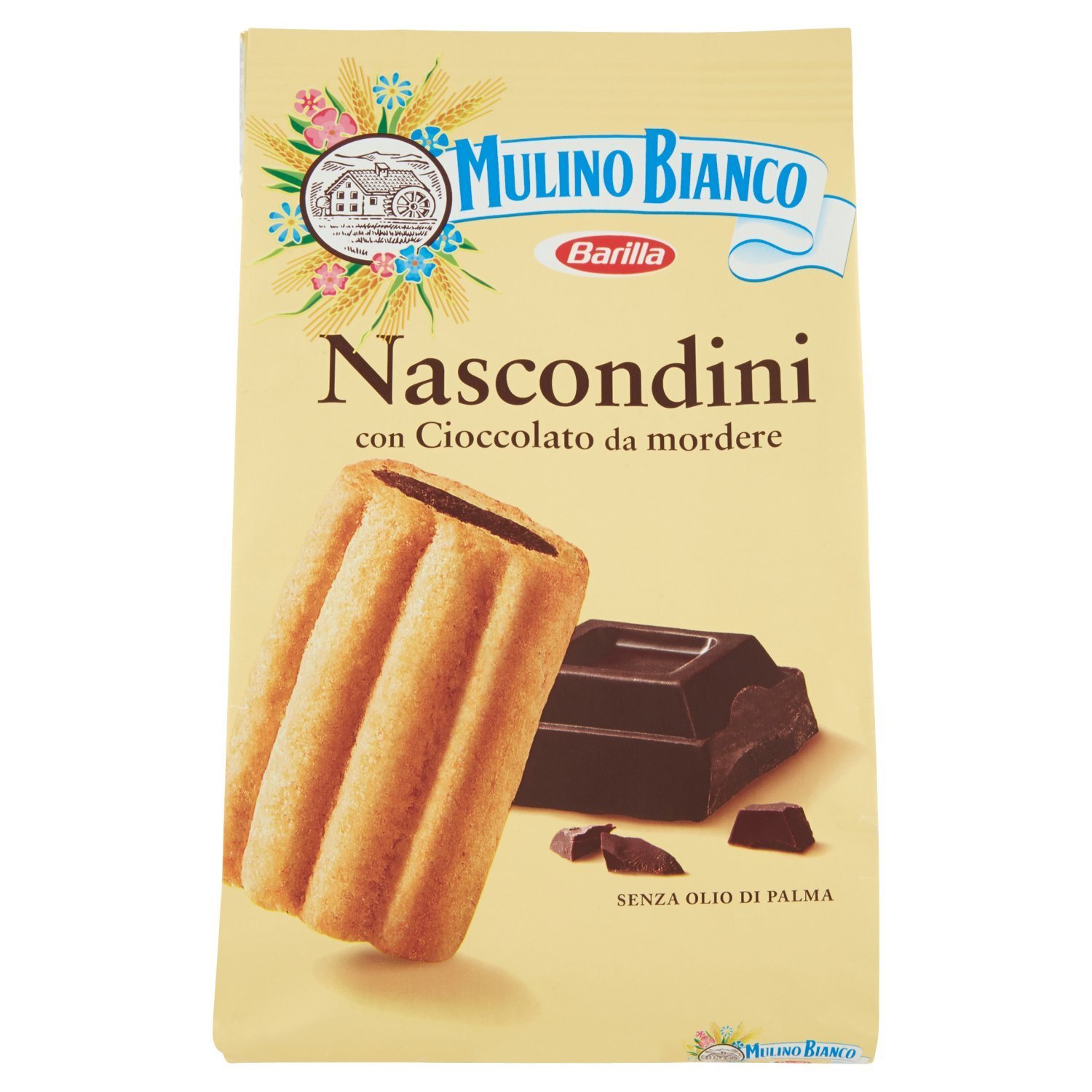 Biscotti nascondini con cioccolato, 600g, Mulino Bianco, Barilla. A colazione risveglia ciò che conta!C’è un mondo che ci aspetta fuori ogni mattina… ma non prima di aver fatto colazione! Perché oltre ad essere un vero e proprio motore per il tuo benessere, la colazione ti regala energia positiva e buonumore.Cominciare nel modo giusto Con dolcezza: Mordere un biscotto con gli occhi ancora semichiusi, sentire l’odore del caffè appena svegli… e godersi il piacere di un sorriso. Senza fretta: I risvegli non sono tutti uguali: ci sono quelli frettolosi, quelli pigri e quelli chiassosi. In ogni caso, goditi il piacere nelle piccole cose di ogni giorno, a cominciare dalla colazione! Una colazione su misura Che sia una colazione leggera o classica, golosa o piena di vitalità, il segreto è che sia il nostro appuntamento irrinunciabile in cui ciascuno può mangiare ciò che vuole. Non esiste infatti un menù mattutino ideale per tutti, l’importante è che copra il 15-20% del fabbisogno energetico giornaliero e non superi le 400 kcal. www.mulinobianco.itUna porzione di 4 Nascondini ti fornisce 236 kcal pari al 12% circa dell’assunzione energetica di riferimento giornaliera*. *Calcolato su una dieta da 2.000 kcal /giorno.Variare spesso i cibi e seguire uno stile di vita fisicamente attivo è il modo giusto per avere una vita sana.Ingredienti Farina di frumento, Zucchero, Cioccolato 12,8% (pasta di cacao, zucchero, burro di cacao, burro, emulsionante: lecitina di soia), Burro, Olio di girasole, Amido di frumento, Uova fresche, Cacao, Latte concentrato zuccherato (latte, zucchero), Agenti lievitanti (carbonato acido di sodio, carbonato acido d’ammonio), Sale, Aroma vanillina, Emulsionante: lecitina di soia, Può contenere tracce di arachidi, frutta a guscio e sesamo