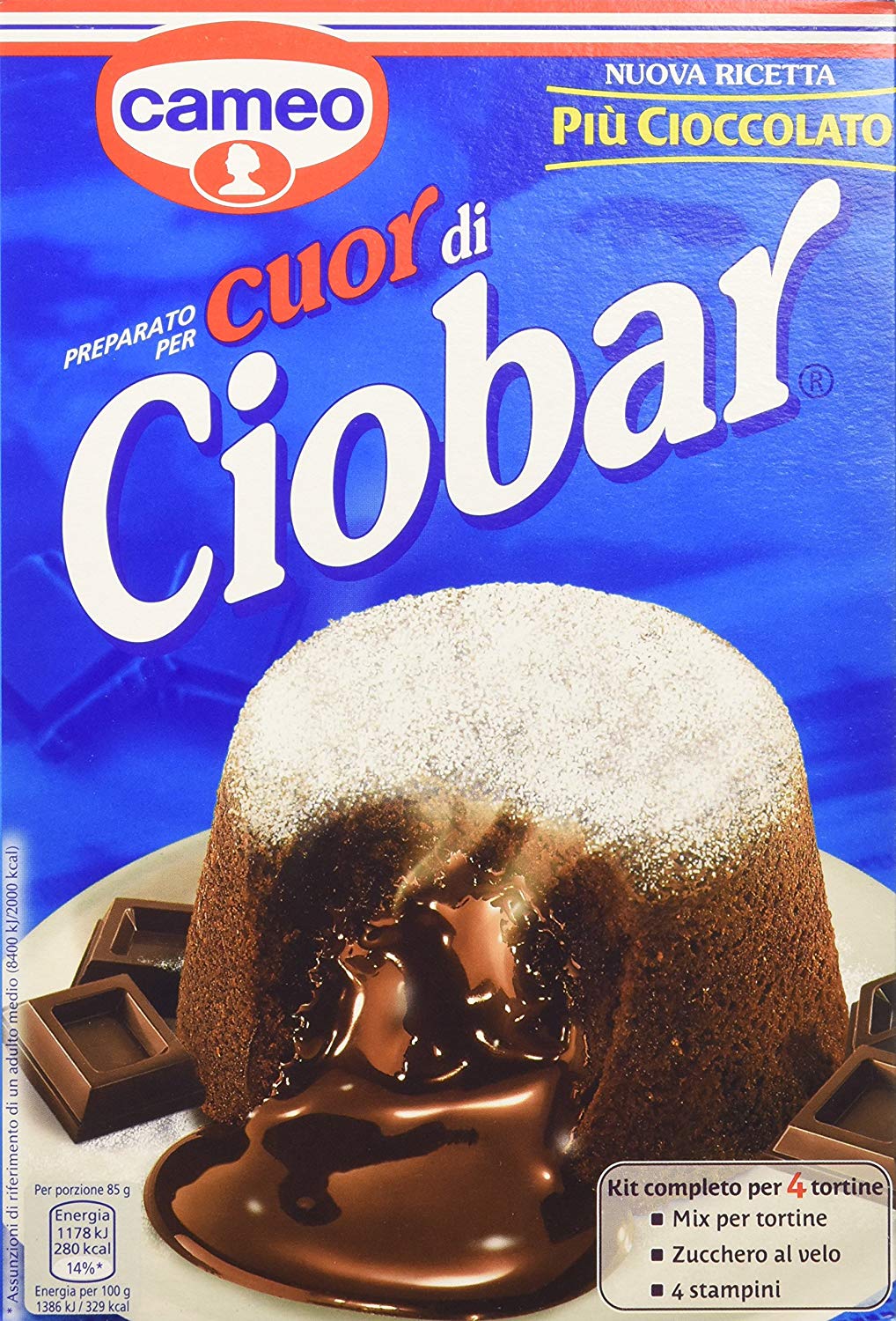 Cameo Torta Cuor Di Ciobar Gr.233, semplice da preparare e buonissimo. Servito appena sfornato. La sua crema all’interno del tortino é cremosa e dolcissima. Preparato per prodotto da forno, contiene 4 preparati per 4 tortine: – Mix per tortine – Zucchero al velo – 4 stampiniCONSIGLI D’USO Cosa si aggiunge – 2 uova mede (60-65g) a temperatura ambiente Temperatura di cottura: forno elettrico statico preriscaldato 240°C | Tempo di cottura 8-9 minuti Temperatura di cottura: forno a gas preriscaldato 220°C | Tempo di cottura: 8-9 minuti Avvertenze: il forno ventilato non è adatto alla cottura dei Cuor di Ciobar. Se il forno cuoce molto dalla parte inferiore porre, all’inizio della cottura, un foglio di carta alluminio sulla lastra del forno. Preliminari Preparare 1 terrina, 1 sbattitore elettrico (o frusta a mano), 1 cucchiaio, 1 lastra da forno. Togliere dal frigorifero le uova mezz’ora prima dell’uso. Preriscaldare il forno e la lastra da forno. 1 Preparazione – Imburrare e infarinare gli stampini. – Versare la miscela in una terrina, aggiungere le uova e mescolare con lo sbattitore elettrico per 1 minuto a velocità media (o frusta a mano per due minuti). – Distribuire l’impasto nei 4 stampini. – Il cuore fluido si ottiene direttamente con la cottura dell’impasto. 2 Cottura – Cuocere i dolcetti sulla lastra del forno preriscaldata, sul ripiano medio del forno elettrico (ripiano alto per il forno a gas), per 8 minuti. Non aprire durante la cottura. Se al termine della cottura la superficie risulta umida, prolungare la cottura di 1 minuto. – A cottura ultimata togliere i Cuor di Ciobar dal forno e lasciare intiepidire per circa 10 minuti su una grata o su un piatto da portata. – Sformare i Cuor di Ciobar capovolgendoli su un piattino da dessert. – Decorare i Cuor di Ciobar con lo zucchero al velo contenuto nella confezione. I Cuor di Ciobar vanno consumati caldi o tiepidi per poter mantenere il cuore fluido. Conservare i Cuor di Ciobar pronti per il consumo in frigoriferoCONSERVAZIONE Conservare in luogo fresco e asciutto.
