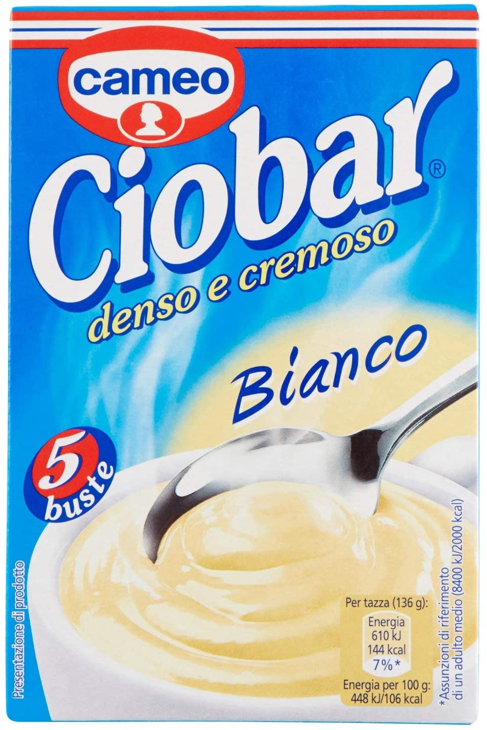 Ciobar denso e cremoso bianco, confezione da 5 buste, 150 g. Preparato per bevanda al gusto cioccolato bianco.CONSIGLI D’USO: Nel pentolinoVersa il contenuto di una bustina nel pentolinoMescola aggiungendo 125 ml di latte un po’ per voltaScalda a fiamma moderata e mescola finché si addensaVersa Ciobar nella tazza e goditi la tua coccola golosa!- Nel microondeVersa il contenuto di una bustina nella tazzaMescola aggiungendo 125 ml di latte un po’ per volta750w per 1′ o 950w per 50”Goditi la tua coccola golosa!Per aumentare la densità prolunga la cottura di 10” alla volta. Per preparare più tazze insieme, cuoci a 750w per 2′.CONSERVAZIONE: Conservare in luogo fresco e asciuttoINGREDIENTI Zucchero, Amido modificato, Sciroppo di glucosio, Panna in polvere, Proteine del latte, Lattosio, Aroma, Sale, Colorante: caroteni, Può contenere grano, uova, frutta a guscio, soia.ALLERGENI Potrebbe contenere: Grano/FrumentoContiene: Panna Può contenere grano, uova, frutta a guscio, soia