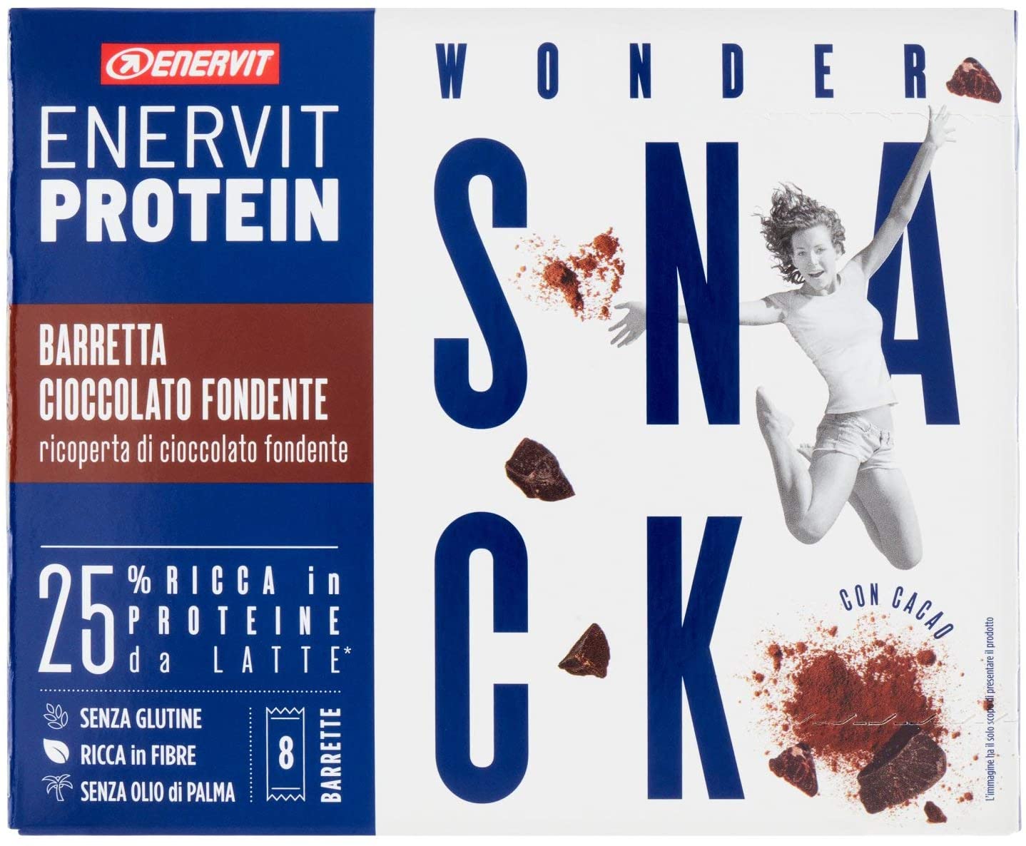 Enervit, Protein Snack cioccolato fondente, barrette energetiche con proteine del latte e fibre, con cioccolato fondente, senza glutine e olio di palma, confezione da 8 barrette da 27 g. Lo snack ricco in proteine, perfetto per aiutarti a rimanere in forma. Una delle regole più importanti per prendersi cura della propria forma fisica: fare uno spuntino a metà mattina e a metà pomeriggio. Per questo abbiamo sviluppato la linea di snack Enervit Protein: composta da barrette ricche in proteine e fibre, senza glutine né olio di palma. Ognuna è studiata per offrirti il corretto apporto proteico, per aiutarti a raggiungere i tuoi obiettivi di forma fisica e ottenere il meglio dalla tua giornata. La barretta proteica Protein Snack Cioccolato Fondente è un’esplosione di intenso gusto, dentro e fuori, grazie al cacao avvolto da una copertura di cioccolato fondente. Con te in ogni momento della giornata. Una passeggiata al parco, un momento di relax a casa, una pausa dal pc: sono tutti momenti ideali per concedersi uno spuntino proteico. Gli ingredienti di prima qualità e il gusto originale, rendono Protein Snack il giusto snack per concederti una pausa quando più ne hai bisogno. Ingredienti Proteine del latte (27,5%) – Cioccolato fondente (23%) (zucchero, pasta di cacao, burro di cacao, emulsionante: lecitine(da soia), estratto di vaniglia) – Sciroppo di glucosio-fruttosio – Umidificante: sorbitoli – Agente di carica: polidestrosio – Cacao magro (3%) (cacao magro in polvere, correttore di acidità: carbonati di potassio) – Burro di cacao – Isomalto-oligosaccaride** – Cacao (1,2%) (cacao, vanillina) – Alfa-ciclodestrina – Fibra di acacia (1,1%) – Aromi – Fave di cacao (0,5%) – Emulsionante: lecitine.**fonte di glucosio. Può contenere tracce di SOIA, SEMI DI SESAMO, FRUTTA A GUSCIO, ARACHIDI.Pacco da: 8 barrette da 27g Gusto: Cioccolato fondente