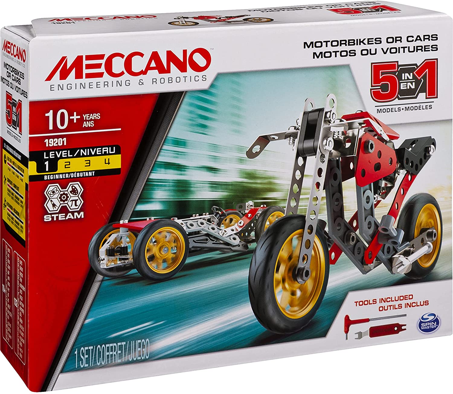 Meccano, Multimodello Moto 5 in 1, Kit di Costruzione S.T.E.A.M., dai 10 Anni – 6053371. Kit di costruzione, auto e moto, 5 modelli 3 auto e 2 moto da costruire con questo baule Meccano. 5 modelli diversi da costruire utilizzando le istruzioni di montaggio (lingua italiana non garantita). Un solo modello può essere costruito alla volta. Strumenti ergonomici per un comfort di costruzione e un montaggio preciso. Compatibile con tutte le parti metalliche Meccano. Usa la tua immaginazione per realizzare le tue creazioni! KIT DI COSTRUZIONE PER 5 MODELLI: con il kit di costruzione Moto Street Fighter 5 in 1 di Meccano, i ragazzini possono creare fino a 5 diversi modelli di moto o auto, come quelli illustrati nelle istruzioni o usare l’immaginazione per creare i propri COSTRUIRE CON VERI ATTREZZI: un’esperienza di costruzione autentica, grazie ai 2 pratici attrezzi, le ruote, veri dadi e bulloni di metallo resistente (tutto incluso) per realizzare 5 eleganti modelli di moto o auto, uno alla volta GIOCO STEAM: man mano che assemblano i modelli con questo kit di costruzione STEAM, i ragazzini impareranno come vengono applicati nella pratica i principi di scienza, tecnologia, ingegneria, arte e matematica Miglioreranno la coordinazione occhi-mano, le abilità di problem-solving e quelle motorie, mentre usano l’immaginazione Il kit di costruzione Multimodello Moto 5 in 1 di Meccano è un regalo perfetto per ragazzini dai 10 anni in su Ulteriori istruzioni di montaggio sono disponibili su Meccanocom Con Meccano, le costruzioni sono solo l’inizio Include: 132 pezzi, 2 attrezzi, 1 guida per l’uso per 3 modelli