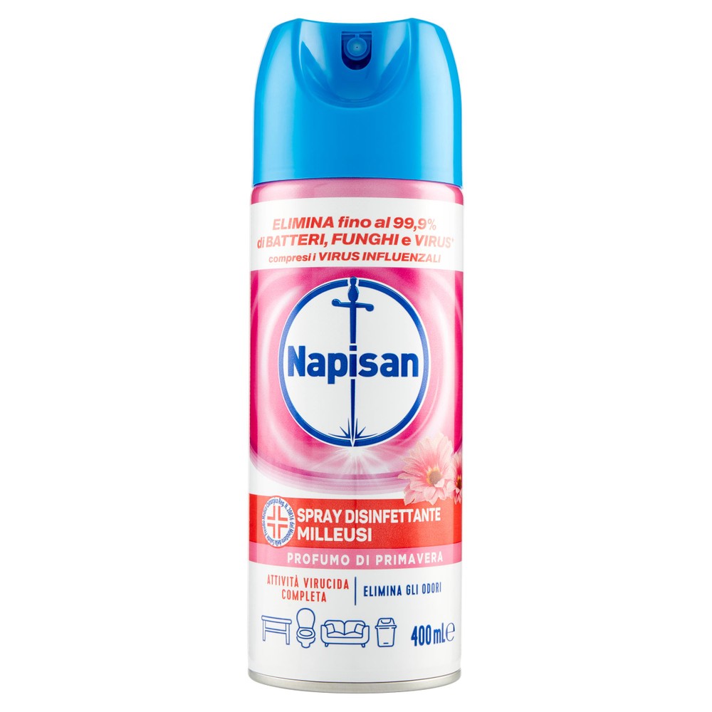 Napisan Spray Disinfettante Ambienti Milleusi, Disinfettante Spray per Tessuti e Superfici, Fragranza Profumo Di Primavera, 400 ml. Elimina fino al 99,9% di virus* batteri e funghi. *Attività virucida completa. *Azione virucida solo su superfici dure non porose CONFEZIONE: Napisan Spray disinfettante ambienti contro virus e batteri 6 unità SPRAY DISINFETTANTE: Napisan Spray disinfettante per l’ambiente elimina gli odori e rilascia una fragranza al profumo di primavera. PERCHE’ UTILIZZARE SPRAY DISINFETTANTE: Indicato per superfici e tessuti d’arredo può essere usato su centinaia di superfici quali quelle del bagno, cucina, divani, materassi, cuscini, scarpe, solette. Facile da usare: non è necessario asciugare con un panno. ISTRUZIONI DI UTILIZZO: Agitare bene prima dell’uso e mantenere la bomboletta ad una distanza di 15-20 cm dalle superficie da trattare, precedentemente pulita. Spruzzare fino a che l’intera superficie sia coperta di prodotto. Fare attenzione a non impregnare i tessuti quando si utilizza il prodotto su superfici morbide. Lasciare agire per 15 minuti. Non c’è bisogno di ripassare la superficie con un panno pulito**. Le superfici possono variare molto. Prima dell’uso, si consiglia di testare sempre il prodotto su una piccola area nascosta. Non utilizzare su pelle, legno lucidato, superfici verniciate o plastiche acriliche. Non adatto per l’igiene personale. Dove utilizzarlo Servizi igienici, bidoni della spazzatura, lavelli della cucina, maniglie delle porte, piastrelle del bagno, piatti doccia, divani, superfici morbide e imbottiture, sedili della macchina, cucce per animali**. Napisan spray disinfettante milleusi può essere utilizzato in casa su superfici quali: Bagno: Vasca da bagno, doccia, WC, rubinetteria, tenda della doccia Cucina: lavandino, cestino dei rifiuti, esterno del frigorifero Casa: pomello della porta, cestini, telefoni, interruttori della luce, cucce per animali** Superfici per i bambini**: cestino per pannolini, fasciatoio, vasino, seggiolone Superfici morbide: divano, materasso, cuscino, tappezzeria/imbottitura, zaini **Per l’utilizzo su superfici per bambini, superfici a contatto con il cibo e superfici a contatto con gli animali: utilizzare solo su superfici dure non-porose e risciacquare con acqua o con un panno bagnato dopo l’uso.