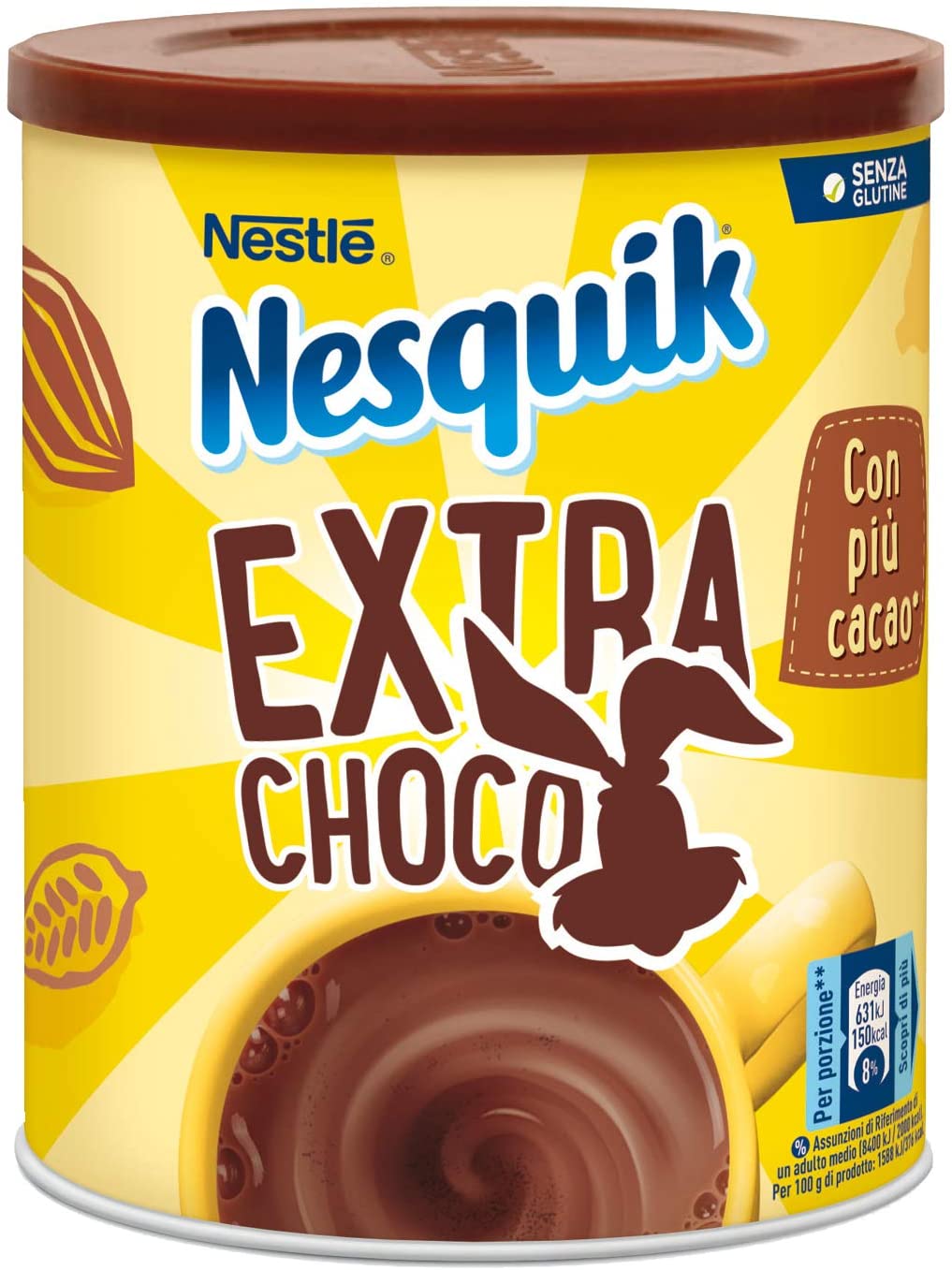 Nesquik Extra Choco Cacao Solubile per Latte Barattolo 390 g. Nesquik extra choco, una ricetta nuova con il 50% di cacao in più rispetto a nesquik opti-start, da gustare in ogni momento della giornata Nella sua preziosa confezione in latta, è l’ideale per chi cerca un gusto intenso e deciso Senza glutine, adatto alle persone intolleranti al glutine Senza coloranti, non contiene additivi che ne modificano il colore Contiene circa 24 porzioni, dose consigliata: 16g (3 cucchiai) di nesquik extra choco + 200ml di latte parzialmente scrematoDall’esperienza Nesquik è nata una nuova ricetta. Nesquik extra choco, con il 50% di cacao in più*, per un piacere ricco e deciso da gustare a colazione, a metà pomeriggio o come coccola della sera. Nella sua preziosa confezione in latta, Nesquik extra choco, è l’ideale per chi cerca un gusto intenso e deciso. Lasciati travolgere dal piacere intenso di Nesquik extra choco in ogni momento della giornata. *rispetto a Nesquik opti-start. Devi sapere che Nesquik extra choco è: – senza glutine, adatto alle persone intolleranti al glutine – senza coloranti, non contiene additivi che ne modificano il colore il formato da 390g è l’ideale per la preparazione di una colazione dal sapore deciso e per quando cerchi una bevanda fresca, intensa e gustosa a merenda o dopo cena. Contiene circa 24 porzioni, dose consigliata: 16g (3 cucchiai) di Nesquik extra choco + 200ml di latte parzialmente scremato. Segui un’alimentazione varia ed equilibrata e uno stile di vita sano. Prova anche Nesquik pronto da bere. La soluzione ideale per portare latte e Nesquik ovunque tu voglia. Dimensioni del collo: 12.19 x 10.16 x 9.91 cm; 480 grammi Nome del prodotto: EXTRA CHOCO Cacao solubile per latte barattolo 390g Peso: 390 Grammi Unità: 390.0 grammo Marca: Nesquik Produttore: Nestlé Italiana Spa Peso articolo: 480 gContenuto della confezione: Cacao Solubile, barattolo 390g